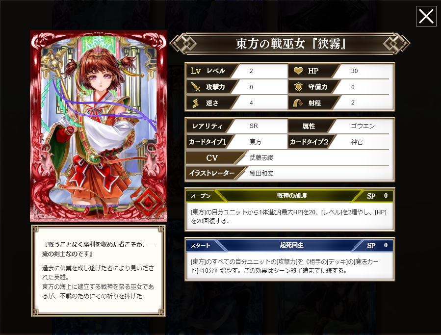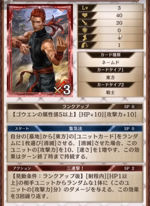 スタート新設・・・ランクアップ後に射程内の相手ユニットの攻撃力をターン終了時まで-30、自身のランクアップを解除。ゴウエンの属性値を1減らす。