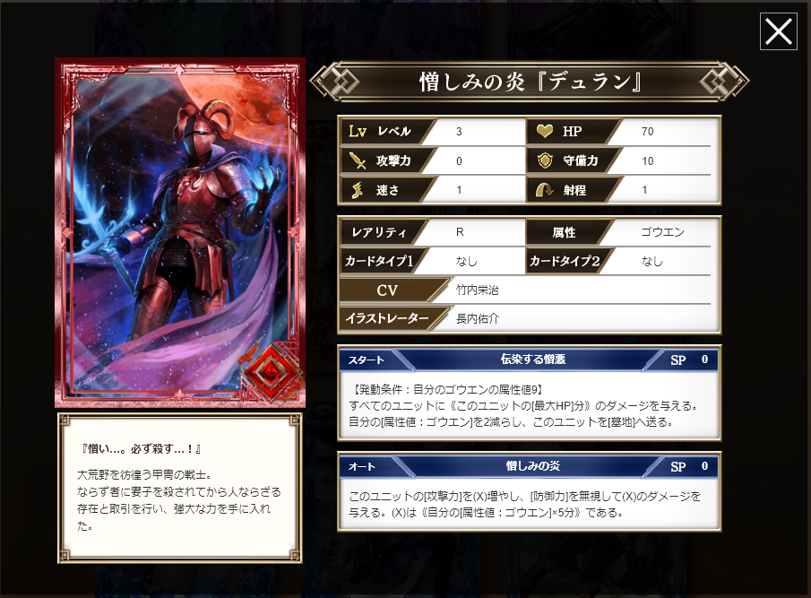 オープンで相手1体の攻撃力-10(永続)、味方のゴウエン名無しの防御力+10(1ターン)